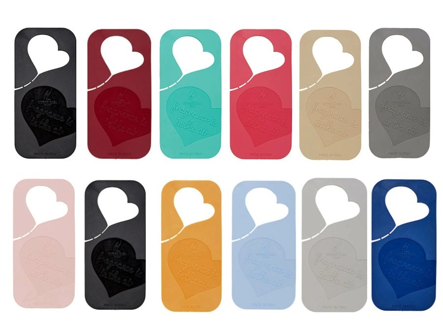 Tavoletta profumata in morbido silicone con foro a forma di cuore per essere appesa sul bastone dell'armadio, maniglia della porta, specchietto della macchina. Un cuore profumato in elegante confezione regalo. Prodotto fatto in Italia. Dimensioni: 6x13cm